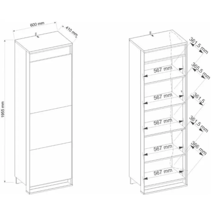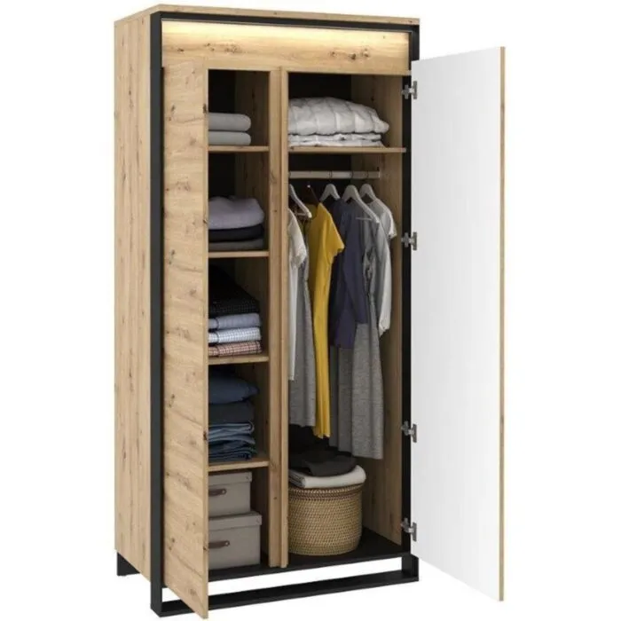 Dvokrilna garderobna omara KVIN 2 je prostorna omara s palico za obešalnike in notranjo knjižno omaro s policami. Omara je prostorna in moderna, zlije se v vsak prostor in mu doda občutek modernosti s pridihom elegance. Ima tudi LED lučke za dodaten prefinjen izgled. S mehanizmom “push to open” se vrata odpirajo počasi ter varno.