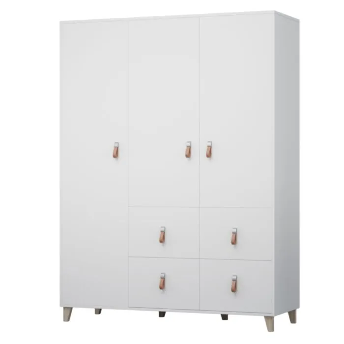 Garderobna omara  LOVY 2 je primerna za vse otroške in mladinske sobe. Omara je trokrilna. Na levi strani ima poličke, na desni pa palico za obešalnike. Dobavljiva je v beli barvi, ročaji pa so iz naravnega usnja. Narejena je iz laminirane plošče debeline 16 mm z ABS robovi. Noge so lesene.