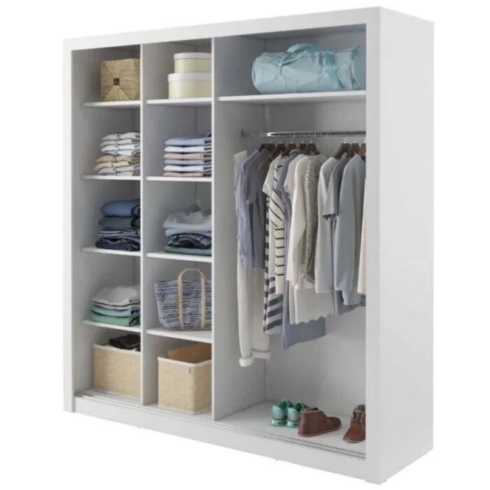 Garderobna omara LUPO ima dvojna drsna vrata s ogledalom.  V notranjosti lahko najdete tirnico za obešalnike in dve notranji polici s policami. Dobavljiva je v beli barvi.