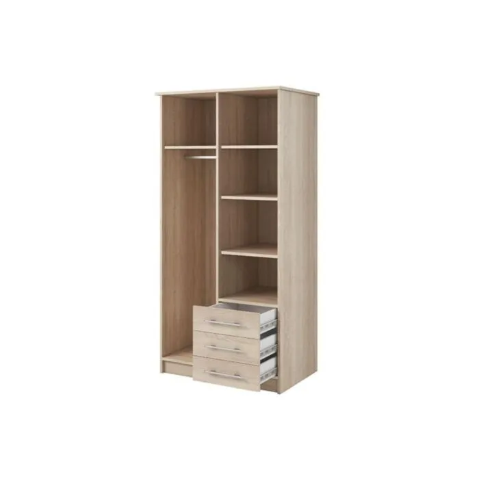 Garderobna omara SARA 2 je dvokrilna omara. Je zelo prostorna in praktična. V levi omari je ena polica in palica za obešalnike, medtem ko v desni omari so poličke. Omara ima tudi tri predalnike. Dobavljiva je v barvi hrast sonoma. Narejena je iz laminirane plošče debeline 16 mm z ABS robovi.