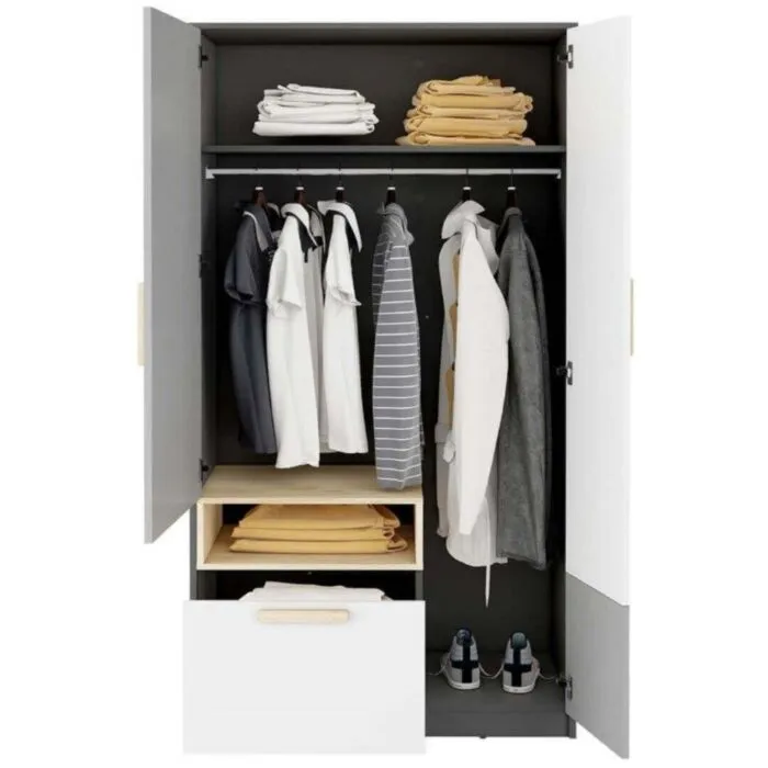 Garderobna omara SIVKO je dvokrilna omara s polico, palico, globokim predalom ter priročno vdolbino. Je v kombinaciji treh barv- svetlo siva, grafitne in bela barva. Ima moderne linije ter brezčasen dizajn.