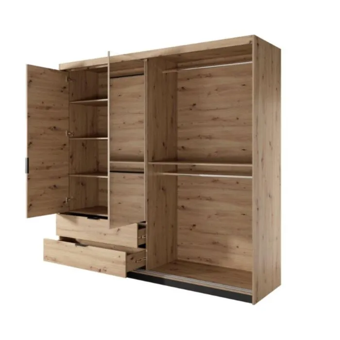 Elegantna in moderna spalnica TINAJA,  je narejena iz odličnih materialov v barvi artisan hrast s kombinacijo antracit. Narejena je iz MDF-ja in ima ABS robove, ki zagotavljajo večjo odpornost proti udarcem, vlagi in obrabi ter podaljšujejo njeno življenjsko dobo. ABS robovi ne le ščitijo pred poškodbami, ampak poskrbijo tudi za lepši in elegantnejši videz pohištva. Garderobna omara ima LED razsvetljavo, katero je možno dokupiti (ni vključena v ceno).