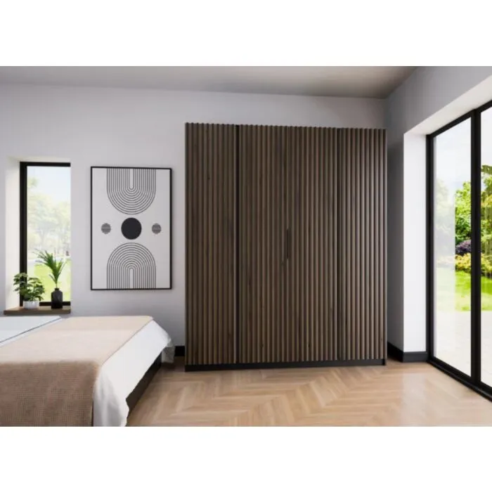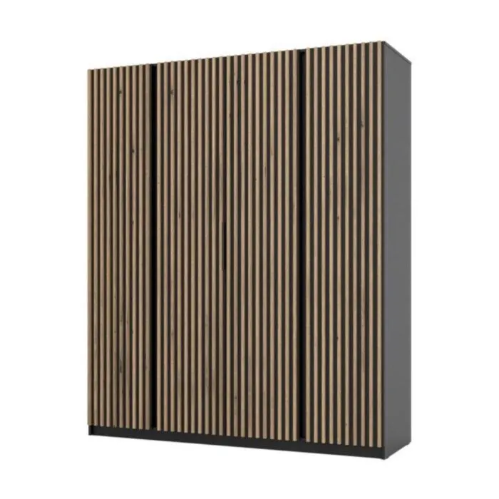 Garderobna omara ZORA 200 cm ima moderen dizajn. Narejena je iz laminirane plošče debeline 16 mm. Stranice so v črni barvi, fronte pa so v hrastu s kombinacijo črne barve.