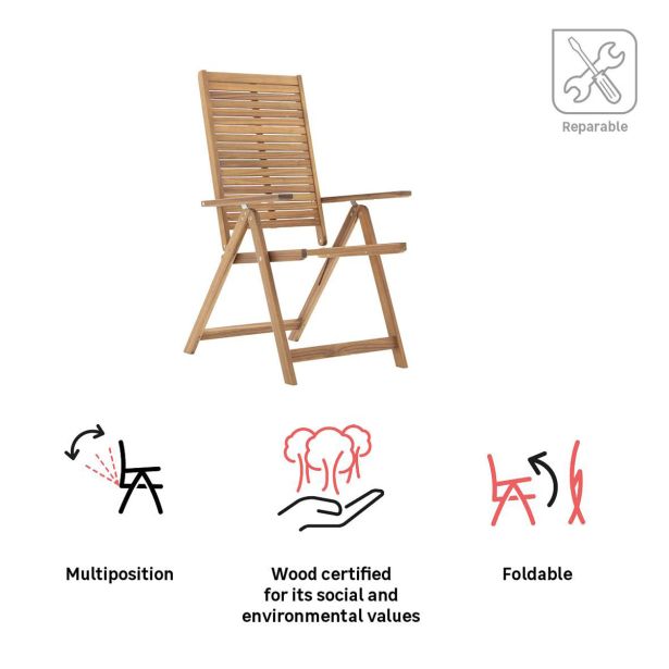 Izdelani iz FSC acacije iz gozdov, katerih upravljanje je priznano kot odgovorno in trajnostno, so ti stoli zasnovani za dolgotrajno uporabo. Da ohranite svoj stol, priporočamo, da ga hranite v zaprtih prostorih v času, ko ga ne uporabljate, ter da les enkrat ali dvakrat letno negujete s teak ali lanenim oljem. So popravljivi, nadomestni deli so na voljo za podaljšanje življenjske dobe vašega pohištva.