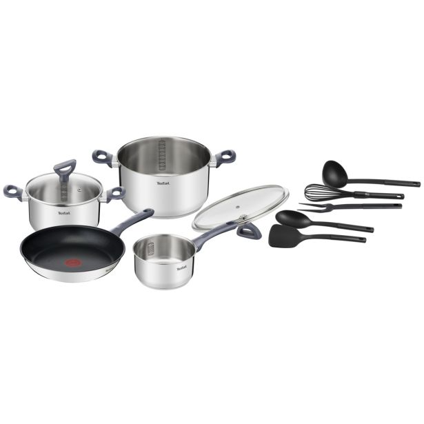 Inovativni 11 delni komplet posod in pripomočkov za kuhanje iz nerjavečega jekla Tefal Daily Cook. Unikatni stekleni pokrovi,ergonomski ročaji za udobje med kuhanjem, varna neoprijemljiva obloga na ponvah in inovativna tehnologija Thermo-Signal za popolne, okusne rezultate iz dneva v dan.