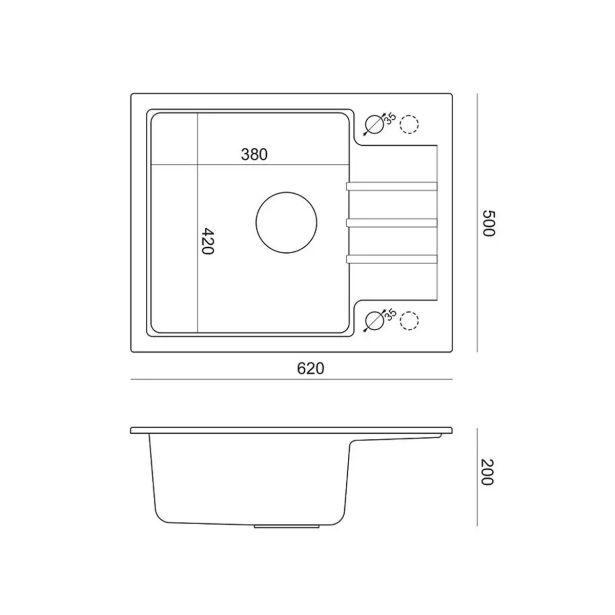 Enojno korito z odcejalnikom, dimenzij 62 x 50 x 20 cm.