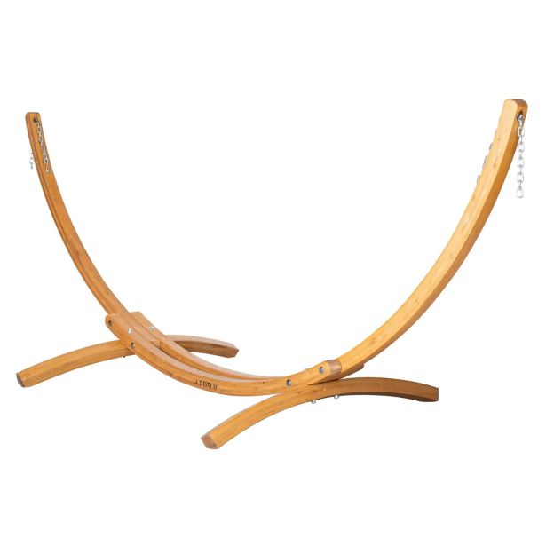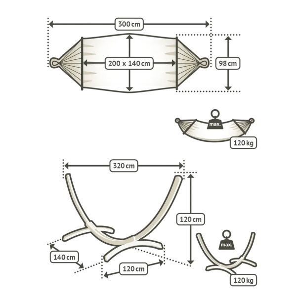 Viseča mreža z napenjalno prečko za zunanjo uporabo v kompletu s stojalom iz macesnovega lesa. Tudi stojalo je obdelano tako, da je odporno na vremenske razmere in ga lahko pustite zunaj celo sezono. Mreža je iz obstojnega in hitrosušečega materijala, ki je odporen na vremenske vplive.