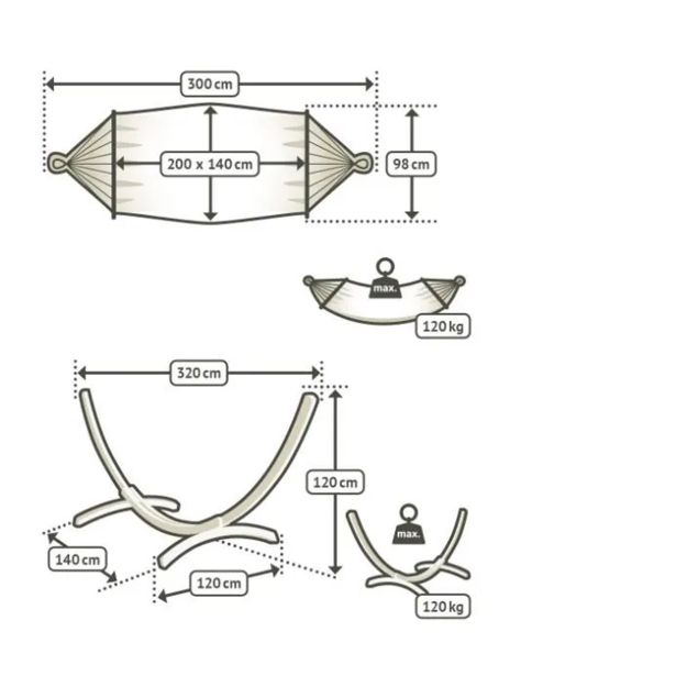 Kakovostna in udobna mreža z napenjalno prečko je primerna za zunanjo uporabo. Dobavljiva je v kompletu z lesenim stojalom iz macesnovega lesa, ki je odporen na vremenske razmere.