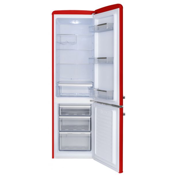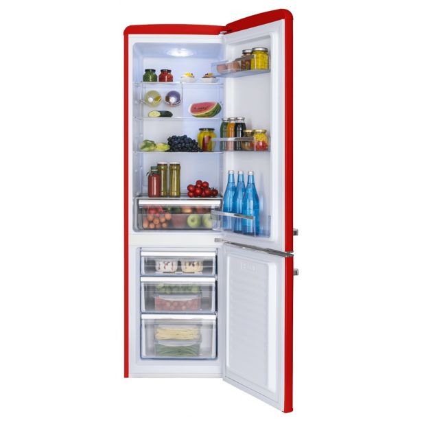 Hladilnik se pohvali s samodejnim odtaljevanjem hladilnega dela, veliko 181 litrsko prostornino hladilnega in 63 litrsko prostornino zamrzovalnega dela. Štiri prostorne police, tri dodatne police na vratih hladilnika ter predal za sadje in zelenjavo v hladilnem delu zadostujejo vsem potrebam velike družine. Prijetna LED osvetlitev in dodaten nosilec za steklenice v notranjosti omogočata izvrsten pregled nad shranjenimi živili. Trije predali v zamrzovalnem delu in 15 urno ohranjanje temperature ob nenačrtovanem izpadu energije zagotavljajo udobno in varno hrambo živil. Atraktivna trendovska retro oblika in izjemno pestra barvna ponudba odražata mladostni pridih nostalgije, ki se elegantno poda v prav vsako kuhinjo.