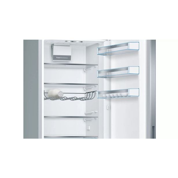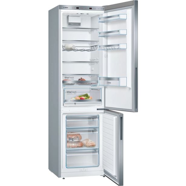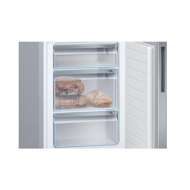 Bosch KGE39AICA prostostoječi hladilnik z zamrzovalnikom spodaj spada v energijski razred C. Ponaša se s skupno prostornino 343 l, sistemom LowFrost, dizajnom v srebrni barvi in premazom proti prstnim odtisom, petimi policami v hladilnem delu ter tremi predali v zamrzovalnem.