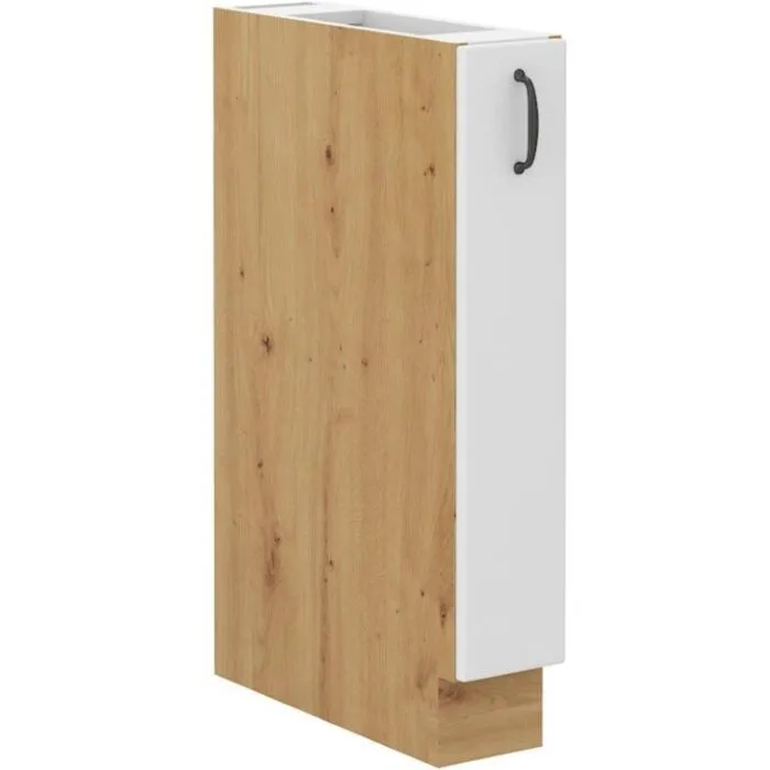 Izvlečna omara STIL 15D je sestavljena iz iz MDF plošče, debeline 16 mm, robovi so iz ABS 1 mm, ročaji pa so iz kovine v črni barvi. Korpus je narejen iz laminirane plošče, debeline 16 mm, robovi so iz melamina. Kuhinjski element je na voljo v barvi hrasta z belo mat barvo in ima mehko zapiranje.