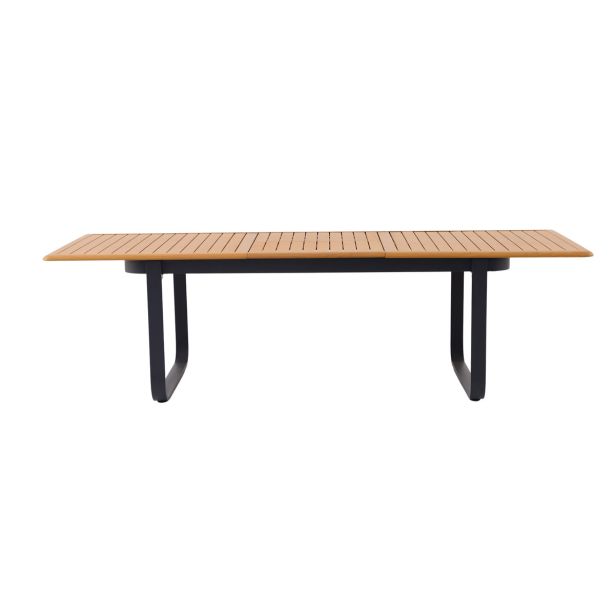 Njene ravne linije in poševni koti odražajo oblikovalski slog, ki ga poudari izbira aluminija kot glavnega materiala. Zlitje temno sive aluminijaste strukture in aluminija z lesnim videzom na vrhu ustvarja bimentalni učinek, ki prinaša čar in sodobnost vašemu zunanjemu prostoru. Za harmoničen videz izberite stole Calypso, ki bodo podprli industrijski slog vaše jedilnice.