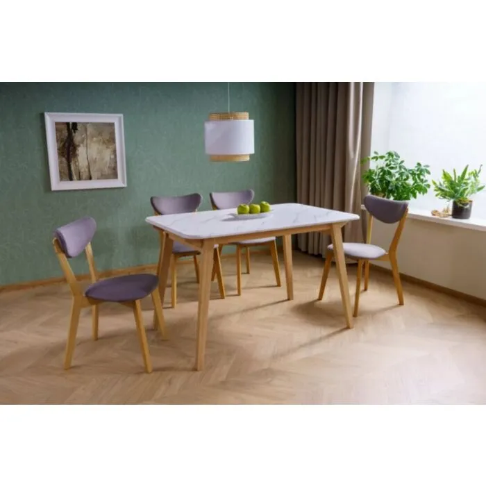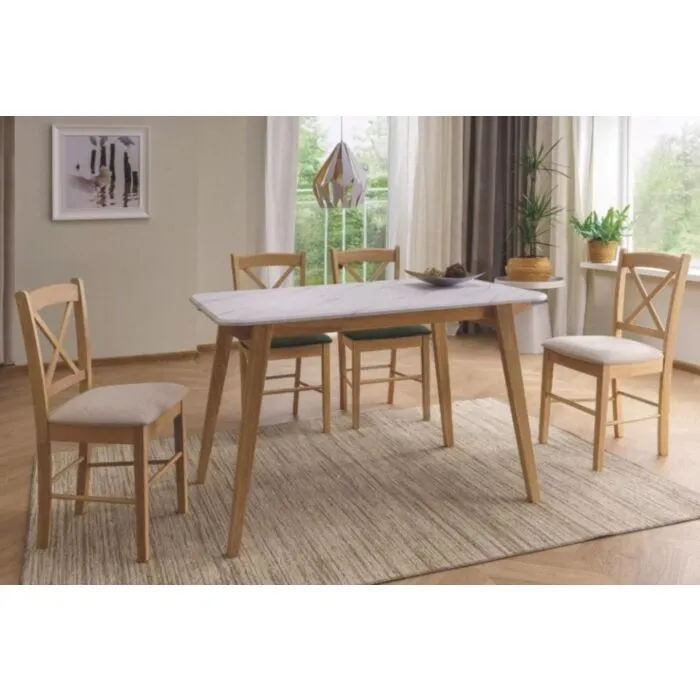 Jedilna miza MARKIS je elegantna in enostavna jedilna miza, ki se odlično poda v vsak prostor. Mizna plošča je narejena iz MDF-ja in melamina v beli barvi z videzom marmorja. Mizne noge so narejene iz lesa v hrast barvi.
