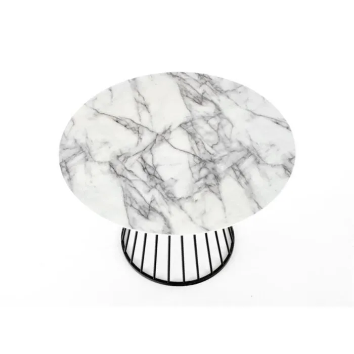 Jedilna miza NARA, bo prinesla svežino in eleganco v vaš prostor. Mizna plošča je narejena iz kakovostnega MDF-ja. Noge so narejene iz kovine. Mizna plošča je v barvi belega marmorja. Noge pa so v črni barvi.