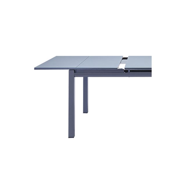Zasnovana za odpornost proti vremenskim vplivom, ima miza popolnoma aluminijasto konstrukcijo, ki je znana po svoji trdnosti, lahkosti in odpornosti na rjo ter vlago. Njen eleganten in preprost dizajn, podprt s štirimi kvadratnimi nogami, zagotavlja stabilnost in udoben prostor za noge. Plošča mize je prekrita s steklom, kar ji daje sodoben in rafiniran videz.