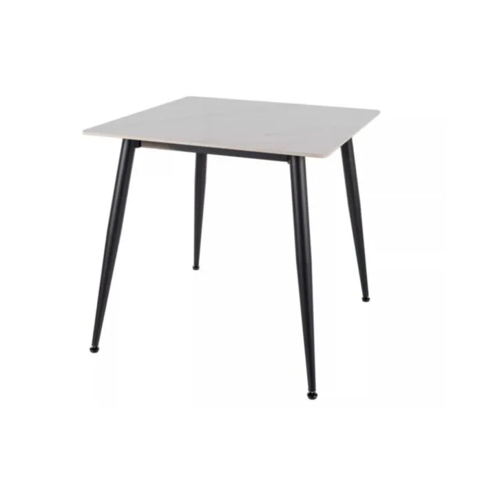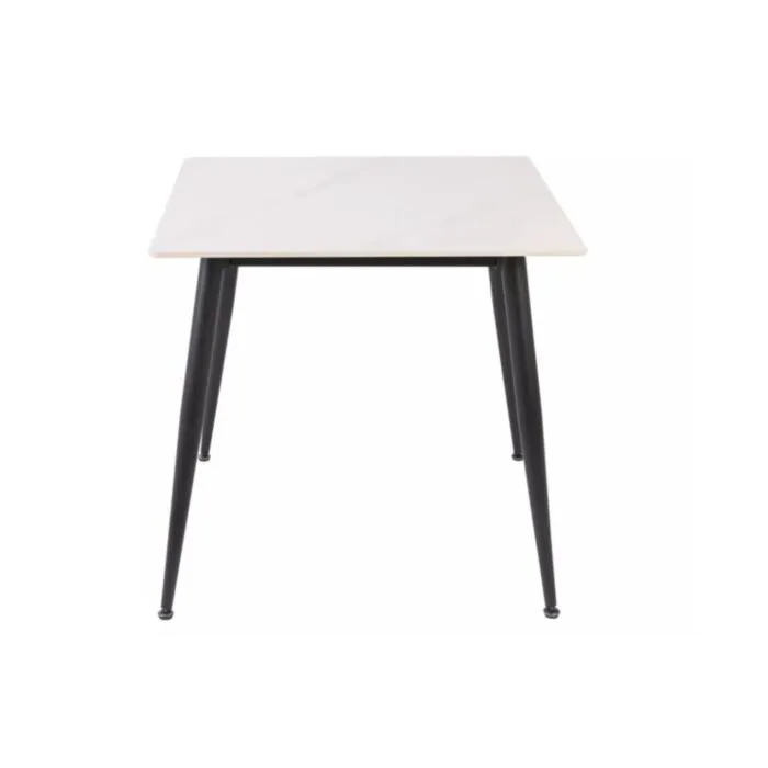 Jedilna miza RIONA je elegantna in priročna jedilna miza, ki se prilega v vsak prostor. Mizna plošča je narejena iz kakovostne keramike v sijaj beli barvi. Ogrodje je narejeno iz kovine v črni mat barvi, kar zagotavlja stabilnost. Mizna plošča ima videz marmorja, kar doprinese dodatni eleganci.