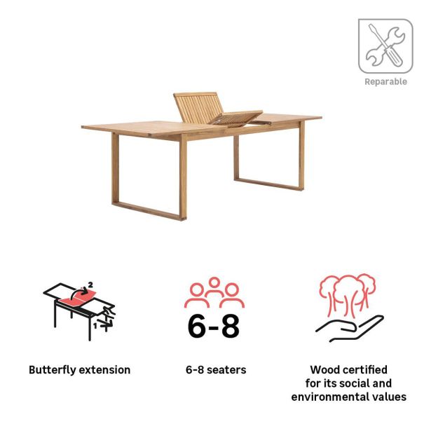 Izdelana iz FSC akacije iz gozdov, katerih upravljanje je priznano kot odgovorno in trajnostno, je ta miza zasnovana, da traja. Za vsakodnevno vzdrževanje zadostujeta malo tople vode in Marsejski milo. Da bi ohranili svoje pohištvo, je priporočljivo, da negujete les z oljem za teak ali lan enkrat ali dvakrat letno ter ga pozimi pokrijete z naravno zračno prevleko. Na to mizo lahko nanesete tudi zaščitno sredstvo, da ohranite njeno prvotno barvo.