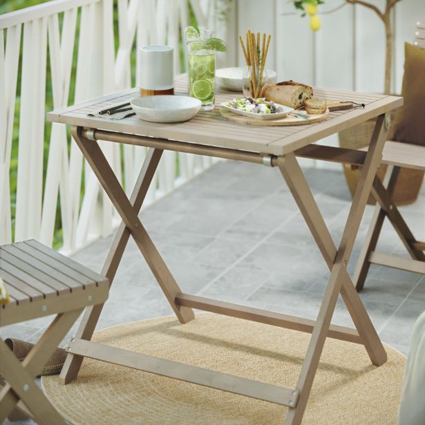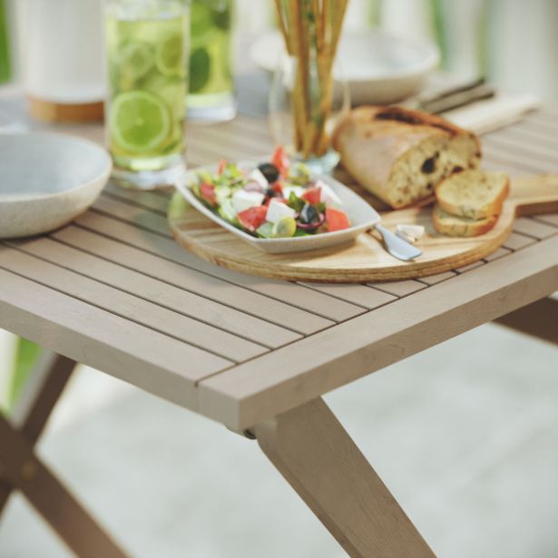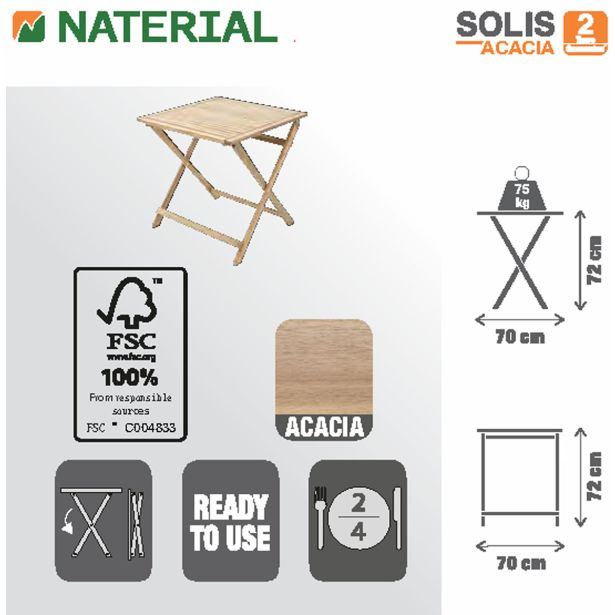Delite prijetne trenutke z družino in prijatelji ob mizi Solis. Ta elegantna miza je idealna za balkone in ozke terase, saj je v celoti izdelana iz akacijevega lesa. Zaradi svoje kvadratne oblike lahko udobno gosti do 4 osebe. Izdelana je iz beljenega akacijevega lesa, ki se odlično upira vremenskim vplivom. Miza Solis je izjemno praktična ? enostavno jo zložite s pomočjo sponk, ki zagotavljajo stabilnost. Zaradi lahke konstrukcije jo lahko preprosto premikate in shranite bodisi pokončno ali vodoravno.