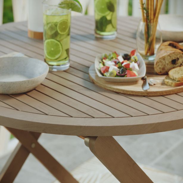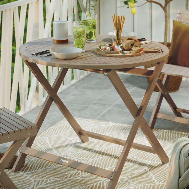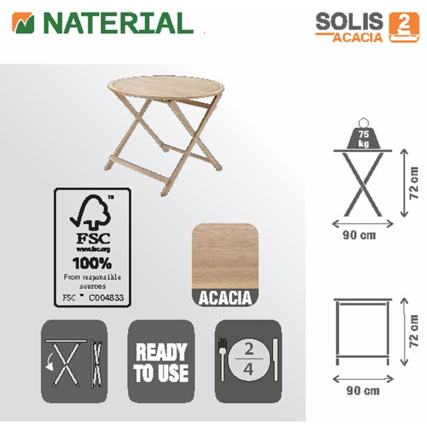 Iščete način za uživanje v sončnih dneh brez izgube prostora? Okrogla miza Solis je zasnovana za 4 osebe. Izdelana je iz beljenega akacijevega lesa in je izjemno odporna na vremenske vplive. Praktična zasnova omogoča enostavno zlaganje s sponkami, ki zagotavljajo stabilnost. Zaradi lahke konstrukcije jo lahko preprosto premikate in shranite bodisi pokončno ali vodoravno.