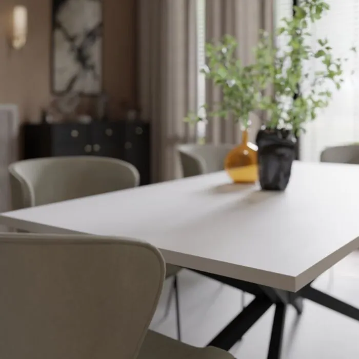 Jedilna miza TIMPLI je elegantna in kakovostna. Odlično se poda v vsak dnevni prostor in jedilnico. Ima kakovostno mizno ploščo debeline 28 mm. Za dodatno stabilnost služijo trpežne kovinske noge v črni mat barvi. Zaradi svoje oblike in visokokakovostnih materialov je trpežna in vzdržljiva. Odporna je na praske, udarce in obrabo. Je enostavena za vzdrževanje, saj je površina preprosta za čiščenje in negovanje. Estetsko se poda v vsak prostor ter ima dobro odpornost na madeže in vlago.