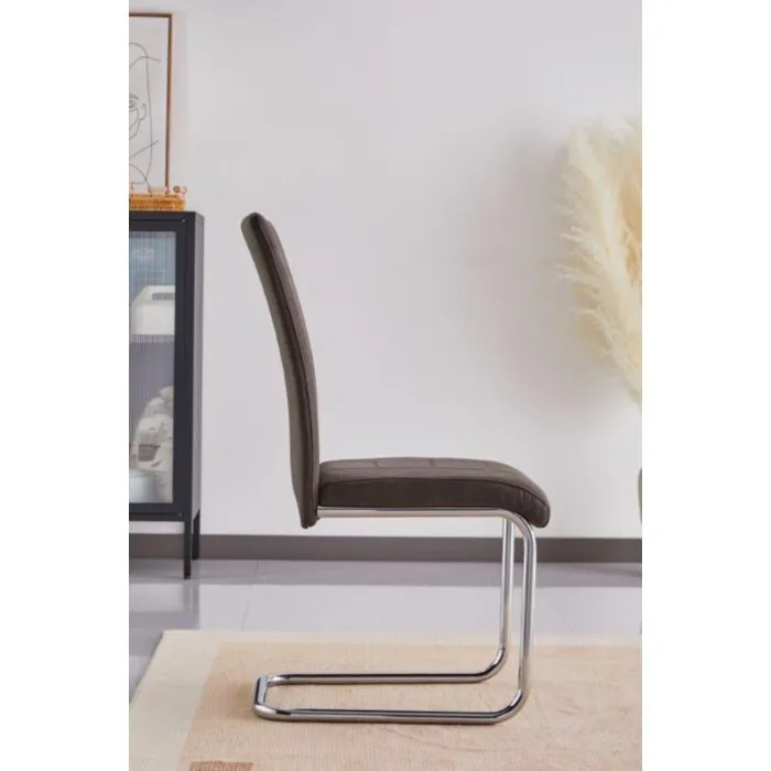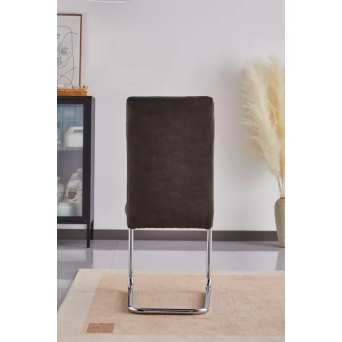 Jedilni stol DANA 2 je elegantne oblike in kakovostne izdelave. Njegov dizajn se bo podal v vsako jedilnico. Oblazinjen je v sivem blagu, ki na videz spominja na umetno usnje. Stol ima močno kromirano podnožje.