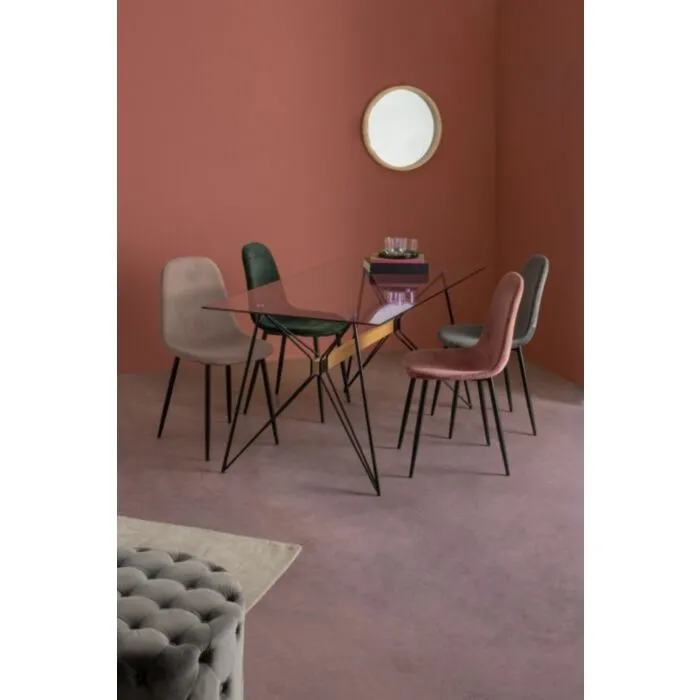 Jedilni stol IRELIA zelena ima kovinske noge, obložen je z peno ki ima prevleko iz poliestra, ki pa stolu daja občutek žameta.
