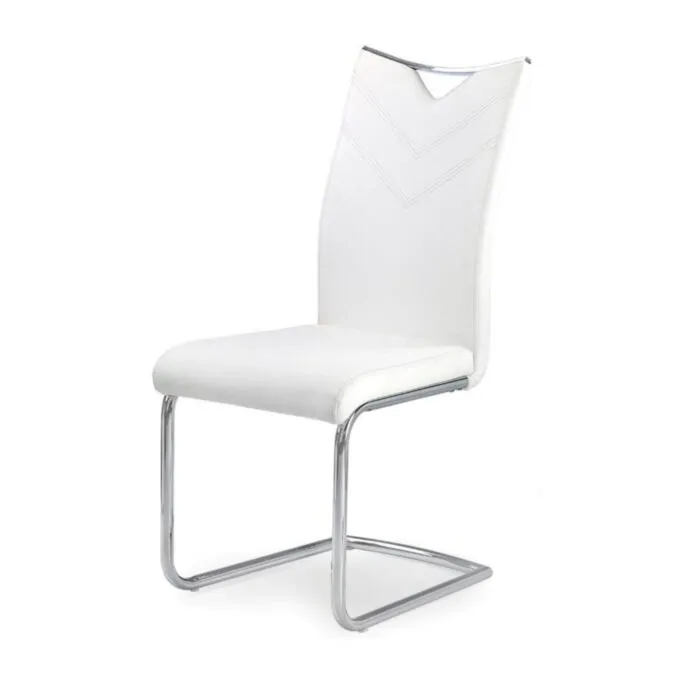 Jedilni stol KUBA je modernega dizajna ter praktičen za uporabo, saj ima zgoraj narejeno držalo za enostavno premikanje stola. Stol je stabilen in vzdržen saj so noge narejene iz kovine v krom barvi. Sedalni del je mehko oblazinjen v belo umetno usnje, kar omogoča enostavno čiščenje.