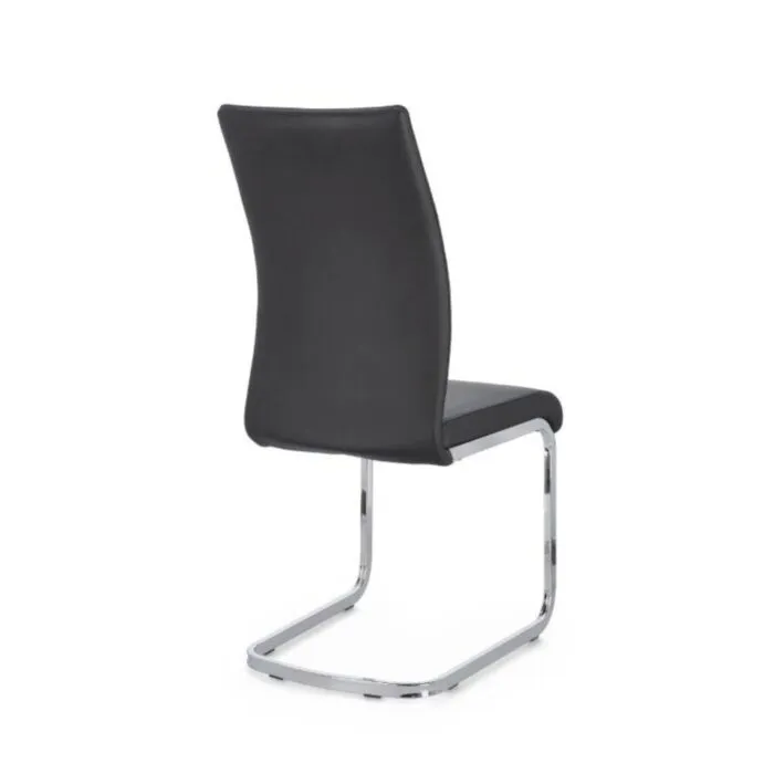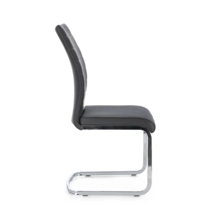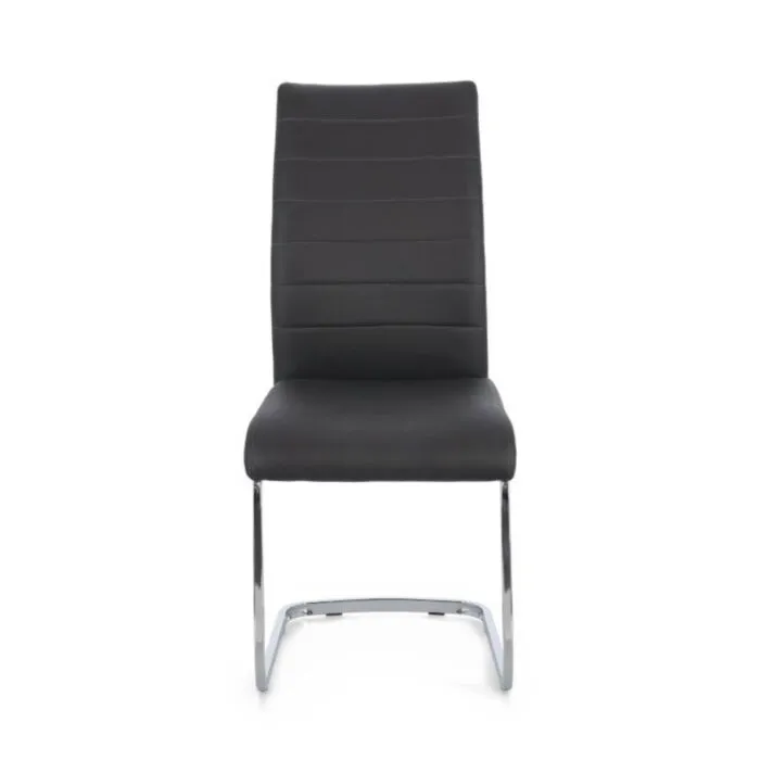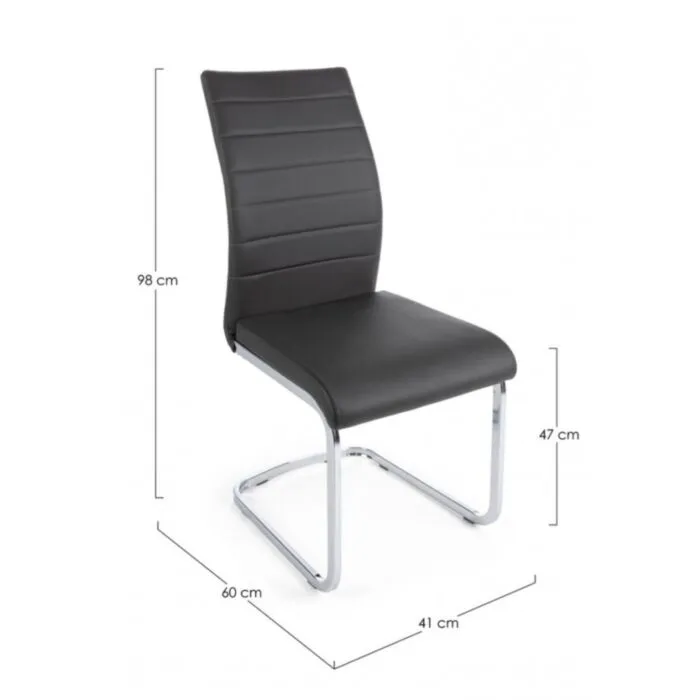 Jedilni stol MYRA PU temno siva, ima noge iz jekla v kromirani barvi. Kar stolu zagotavlja stabilnost in prefinjen videz. Sedež in naslonjalo sta polnjena s poliuretansko peno za dodatno udobje. Oblečen je v sivo umetno usnje.