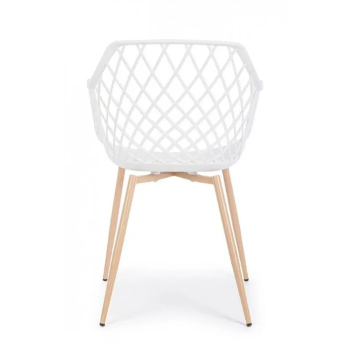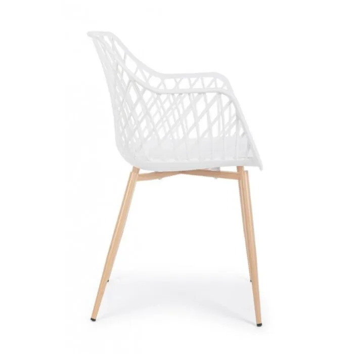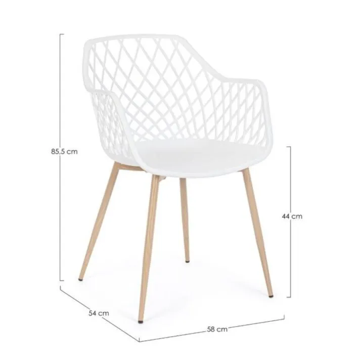 Jedilni stol OPTIK v beli barvi. Ima jeklene noge z imitacijo lesa, kar doda pridih naravnega videza ter hkrati nudi stabilnost. Sedalni del je iz kakovostne plastike kar omogoča enostavno vzdrževanje. Stol je funkcionalen in idealna izbira za sodobno jedilnico.
