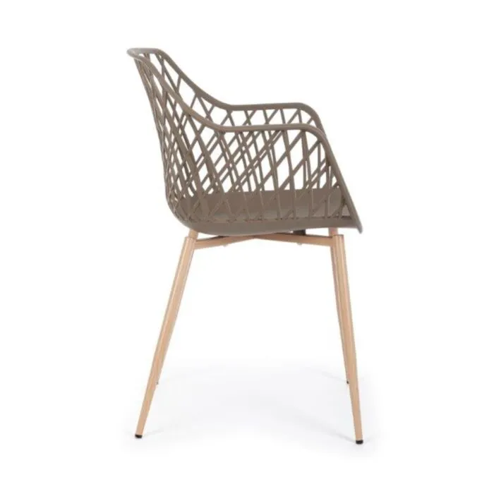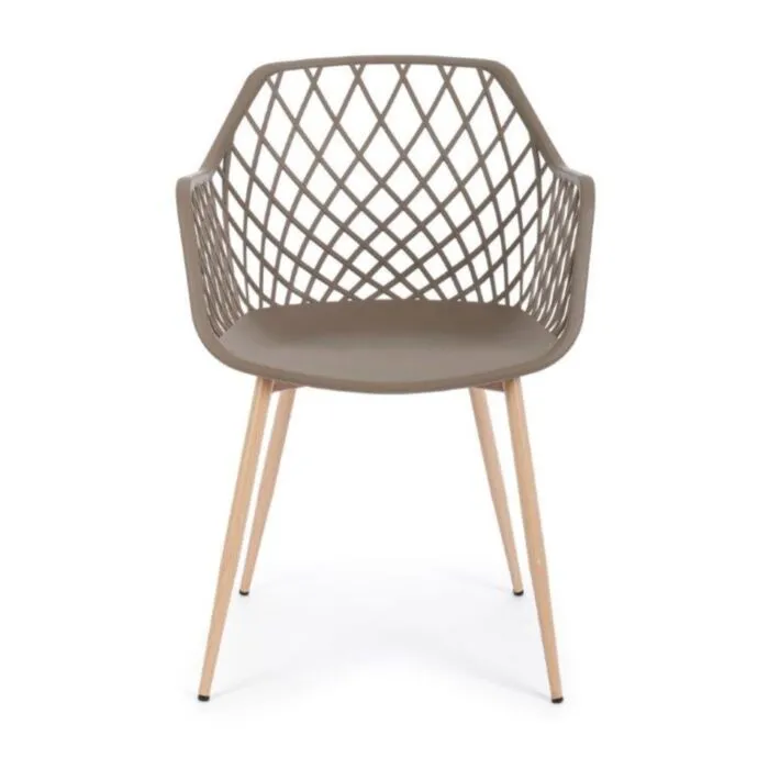 Jedilni stol OPTIK v taupe barvi je modernega dizajna. Zato je idealen za moderno jedilnico ali kuhinjo. Sedalni del je izdelan iz kakovostne plastike, ki je enostavna za vzdrževanje. Kovinske noge, ki imitirajo les, dajejo stolu naravni videz, obenem pa zagotavljajo trpežnost.