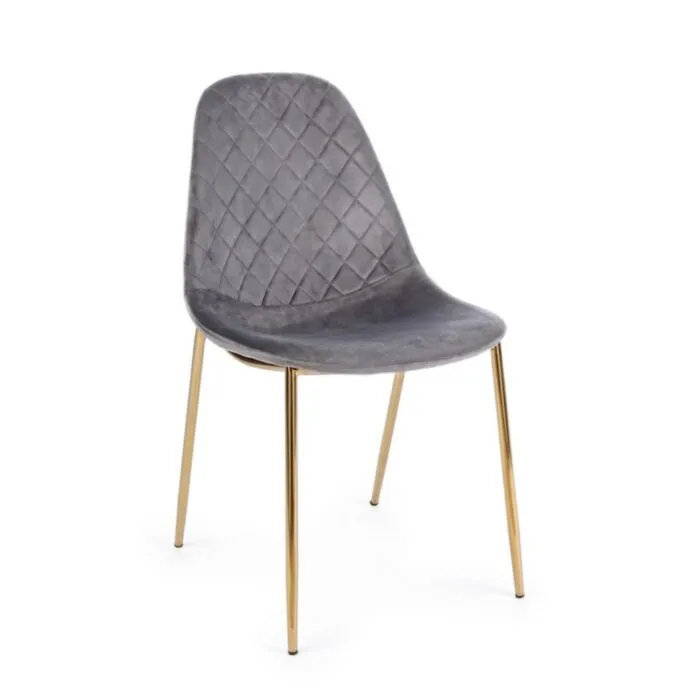 Kuhinjski stol TERRY je sestavljen iz kovinskih cevastih nog, z zlatim kromiranjem. Naslonjalo in sedež sta obložena s poliuretansko peno in oblečena v žamet (100% poliester).