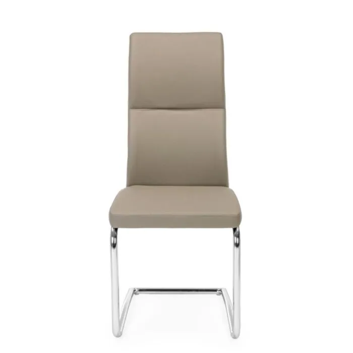Jedilni stol THELMA taupe ima jekleni okvir in kromirane noge. Polnilo je iz poliuretanske pene, oblečen je v umetno usnje.