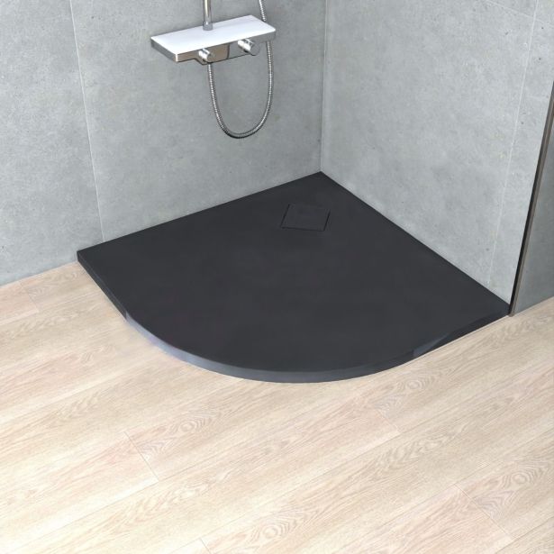 Polkrožna tuš kad iz litega marmorja z reliefno površino v temnem ali sivem odtenku čiste elegance.