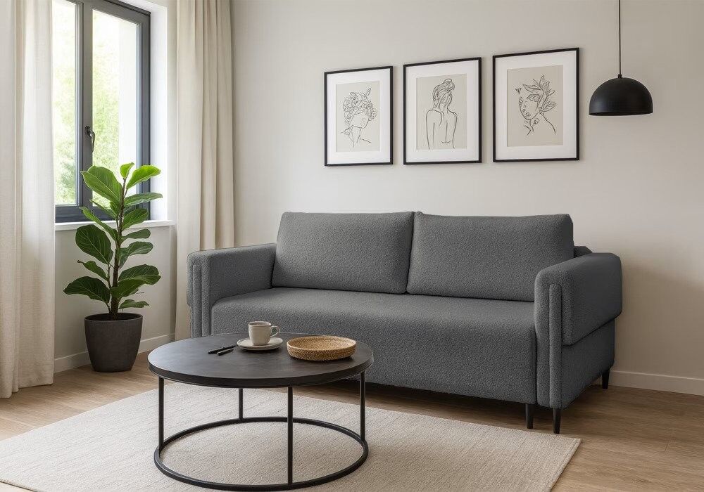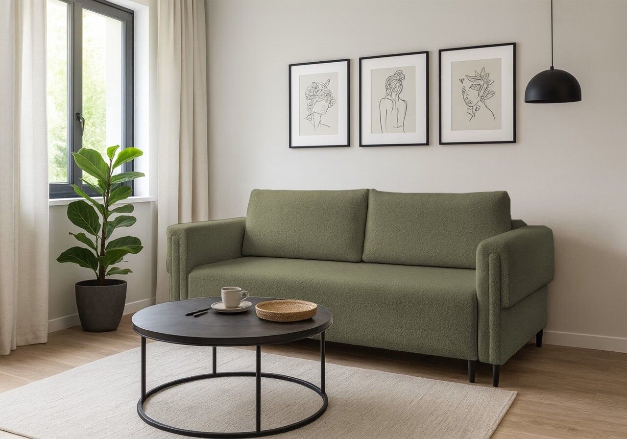Narejen je iz kakovostne tkanine, ki je mehka na dotik. Njegova edinstvena tekstura in subtilen videz dodata toploto in prefinjen slog v vsak prostor. Hrbtna stran kavča je prekrita s tkanino v barvi oblazinjenja, kar omogoča prosto postavitev v prostoru. Izdelan je iz visokokakovostnih materialov, v sedežu in naslonjalu ima Bonell vzmet ter mehko peno. Ima inovativni sistem zlaganja DL. Sistem DL omogoča enostavno in lažje preoblikovanje troseda v ležišče. Ogrodje je narejen iz masivnega lesa.