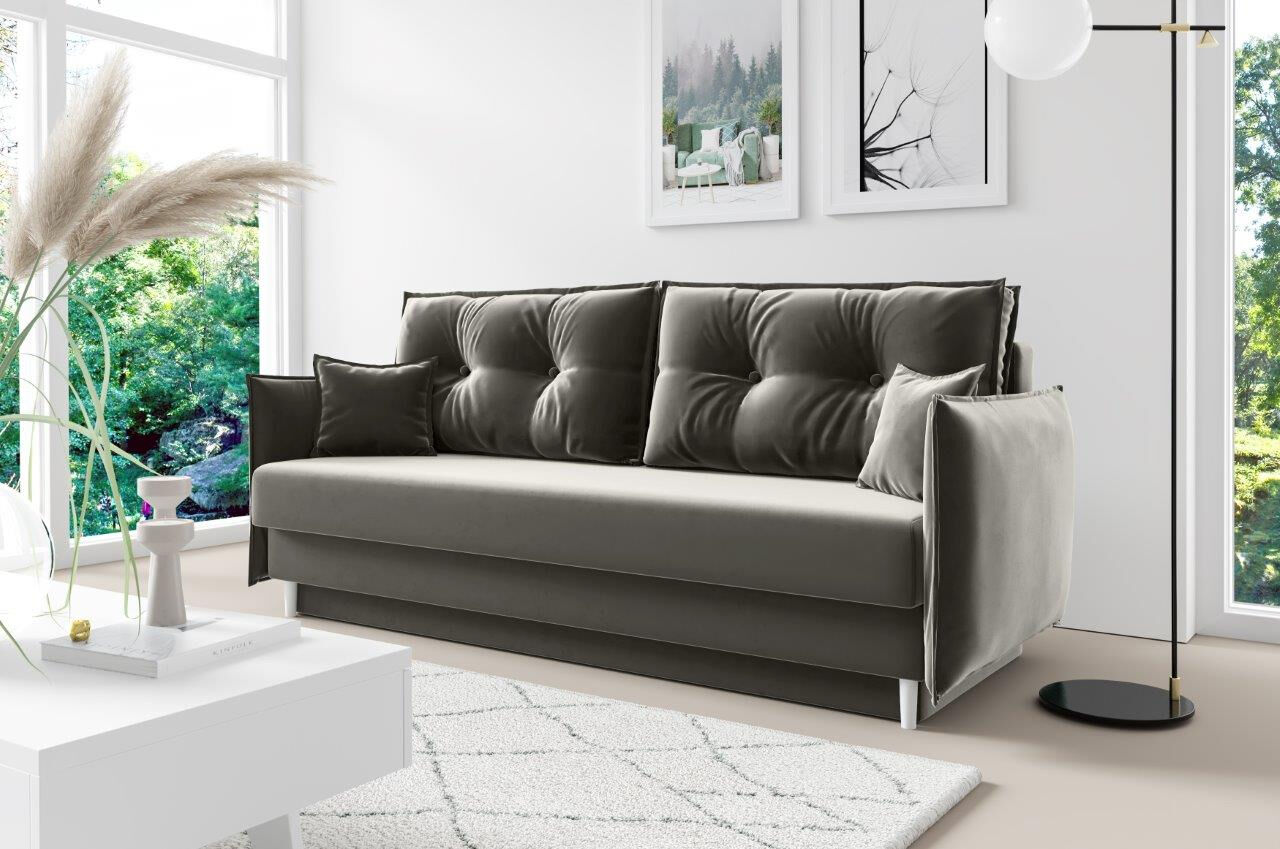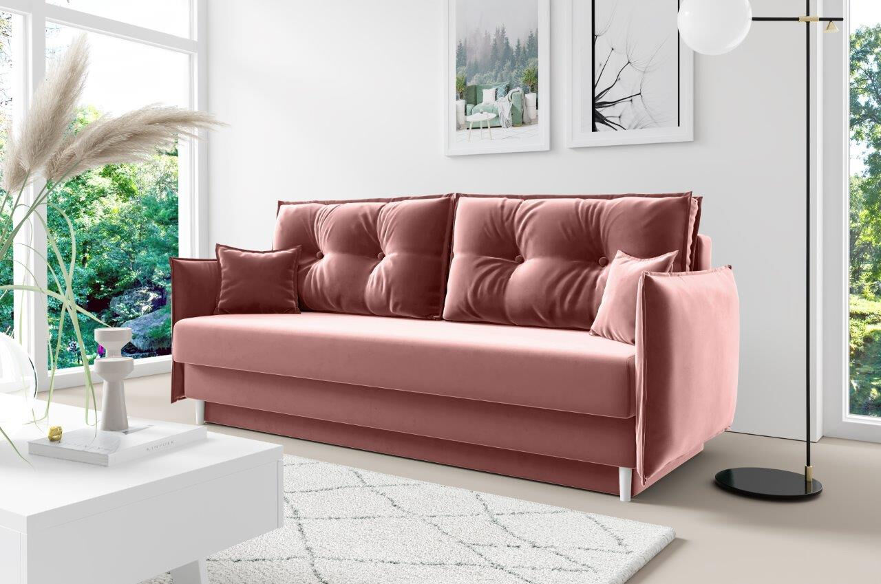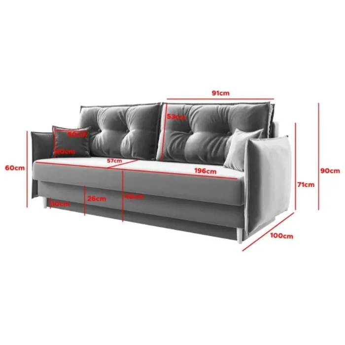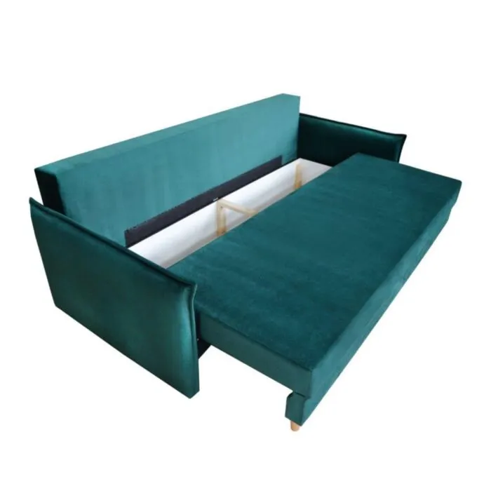Raztegne se v ležišče in ima zaboj za spravljanje posteljnine ter različnih stvari. Na voljo je v več barvah. Zraven garniture dobite pripadajoče majhne blazine, kakor prikazano na sliki.