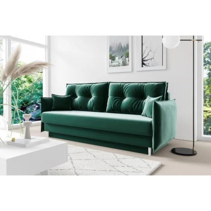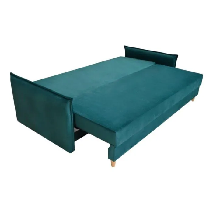 Raztegne se v ležišče in ima zaboj za spravljanje posteljnine ter različnih stvari. Na voljo je v več barvah. Zraven garniture dobite pripadajoče majhne blazine, kakor prikazano na sliki.