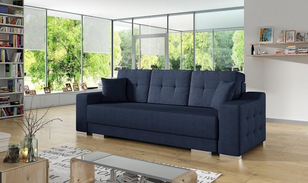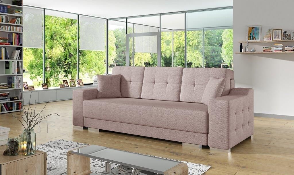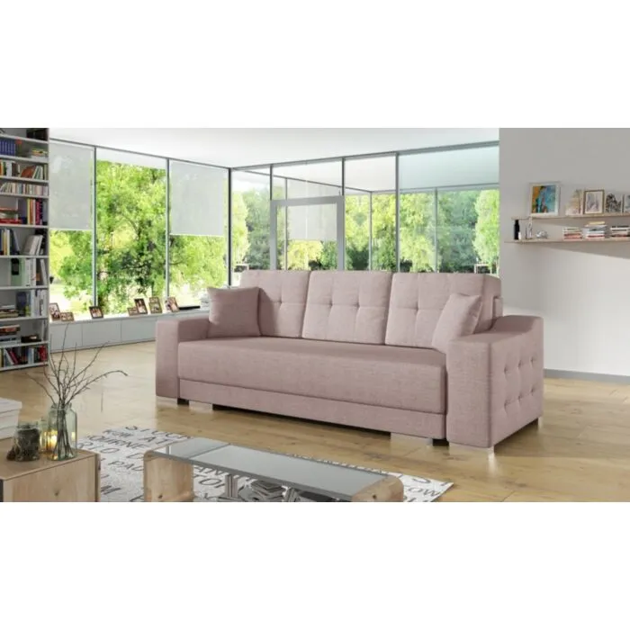MARSAL je klasičen kavč iz kakovostne tkanine. Pri raztegnitvi v spalni položaj vam pomaga posebni mehanizem. Vzmetenje je valovitega tipa. Ima prostor za shranjevanje posteljnine. Zraven dobite dve okrasni blazini v barvi tkanine kavča.