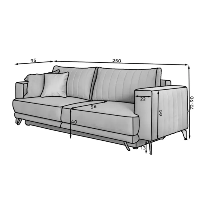 – D: 250 cm x G: 95 cm x V: 90 cm