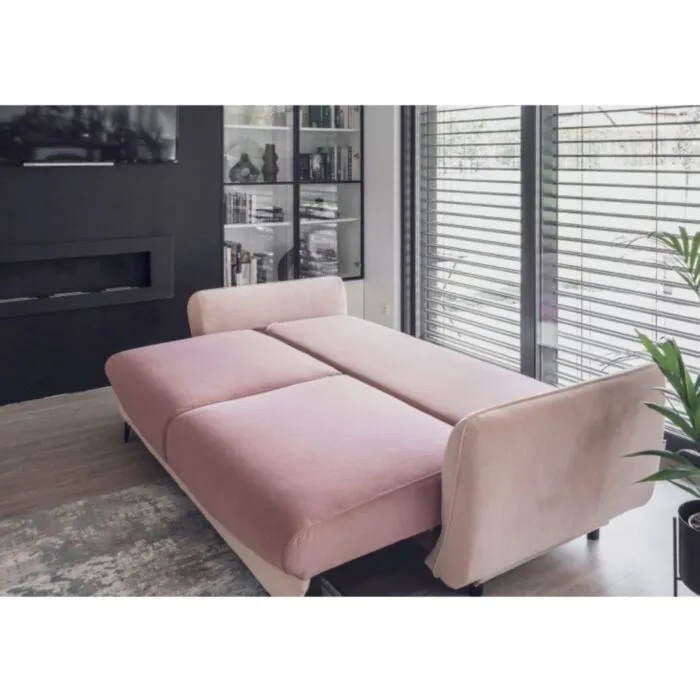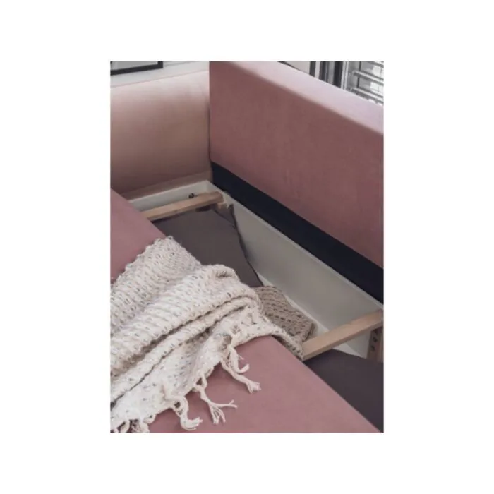 Kavč Valerija 4 je narejen iz vrhunskih materialov. Dobavljiv je v kvalitetnem mehkem blagu, v odtenku svetlo roza in temno roza. Ima pomožno ležišče ter vsebuje zaboj za shranjevanje posteljnine. Vzmeten je z valovitimi vzmetmi.