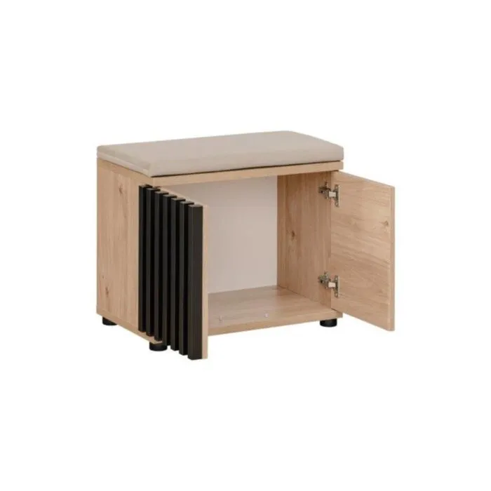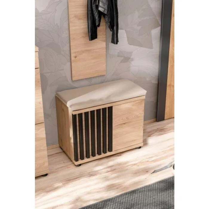 Klop za predsobo BENO je elegantna ter atraktivna. Moderen dizajn v barvi svetlega hrasta z dodatkom lamel v črni mat barvi, se bo podal v vsak prostor. Klop ima oblazinjeno sedišče v bež barvi.
