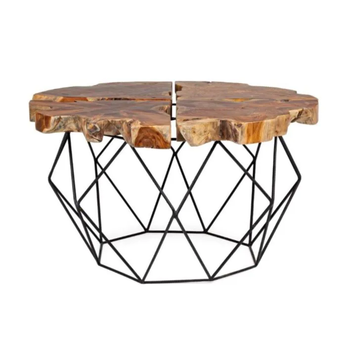 Klubska miza ADANYA D80 ima vrh iz tikovine z naravnim zaključkom in jeklene noge. Oblike in velikost, ki jih tvori les, so samo okvirne.