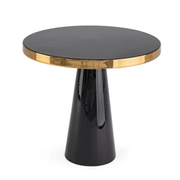 Klubska miza NANDIKA D51 črna ima kovinski okvir ter zgornji rob z medeninastim zaključkom. Je v črni barvi z zlatim dodatkom. Odlično se poda v vsak prostor, ne glede na to ali je to gostinski obrat, hotelski ambient ali pa vaša dnevna soba.