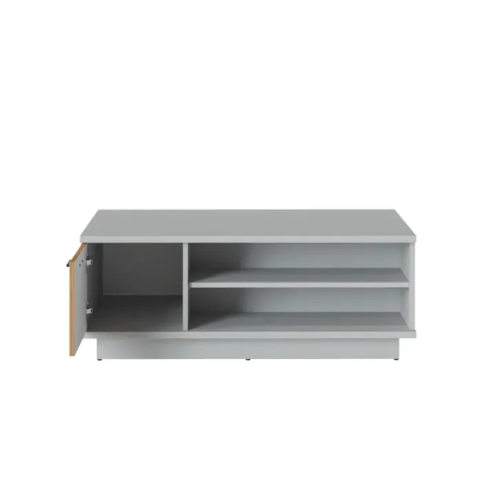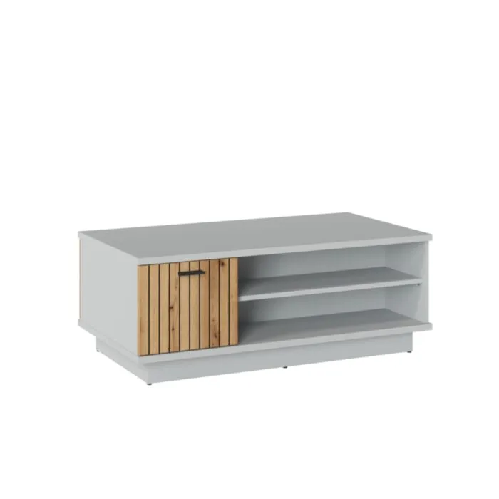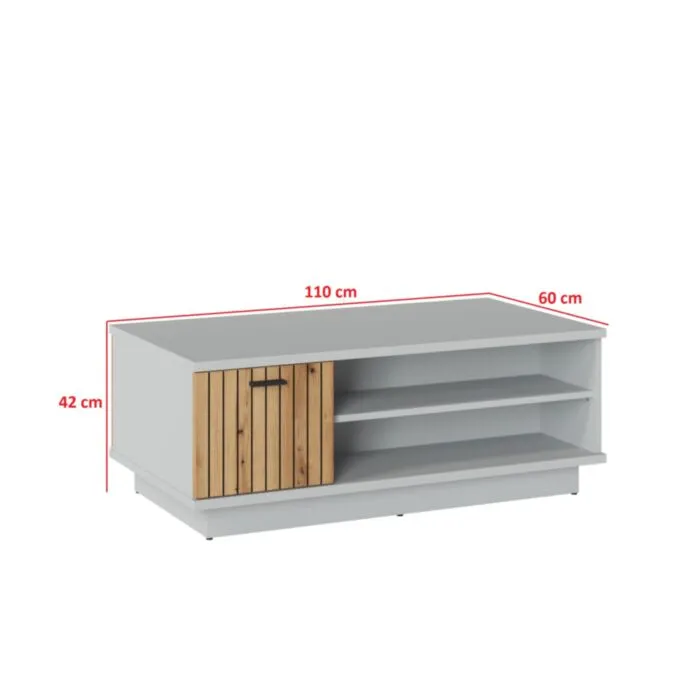 Miza ima dve priročni polici za shranjevanje revij, knjig ali daljinskih upravljalnikov, poleg tega pa vsebuje tudi predal z edinstvenim, rahlo izbočenim hrastovim detajlom, ki dodaja pridih elegance in izjemno teksturo. S svojim praktičnim dizajnom in estetsko privlačnostjo je ta miza idealen dodatek za organiziran in stilno opremljen dnevni prostor.