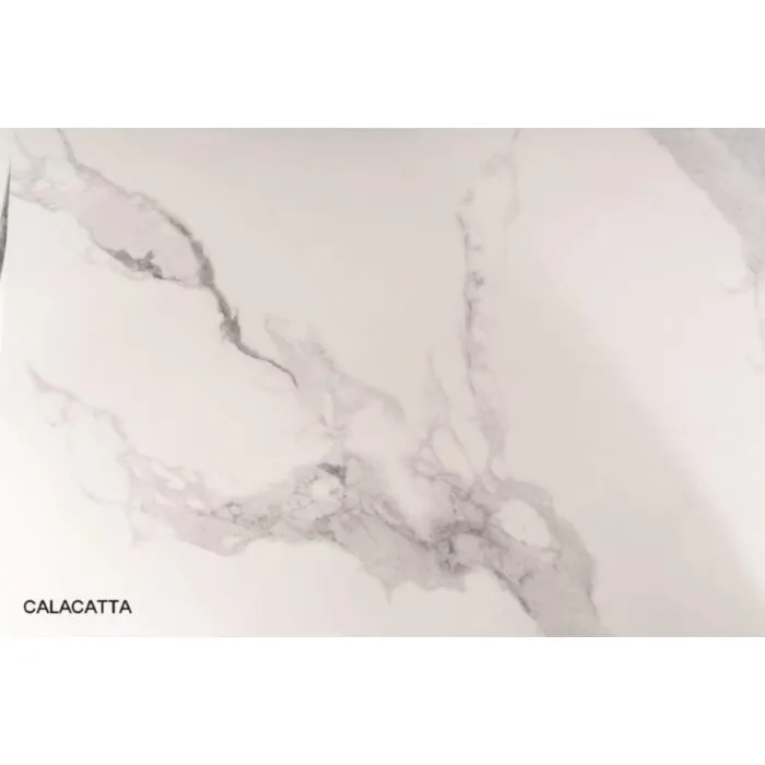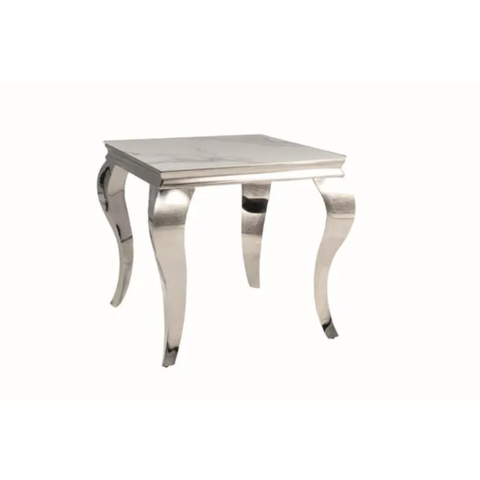 Klubska mizica KRALJ BELA modernega dizajna. Mizna plošča je narejena iz keramike v videzu marmorja v beli visoki sijaj barvi. Mizno podnožje je narejeno iz nerjavečega jekla v krom barvi.
