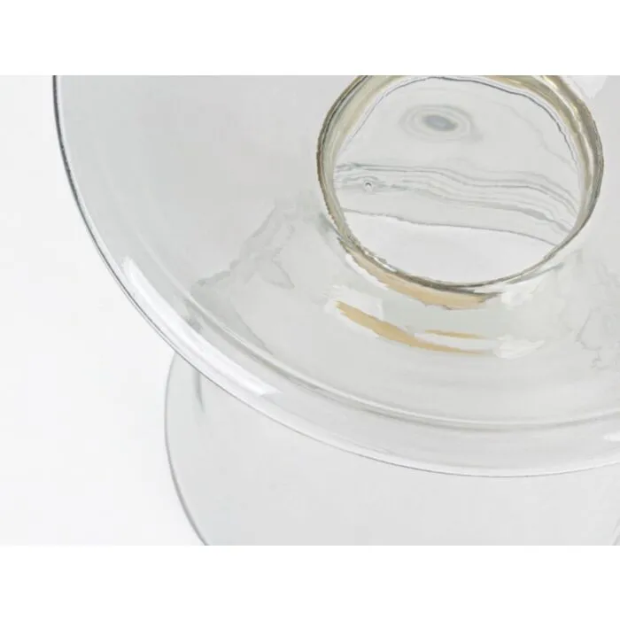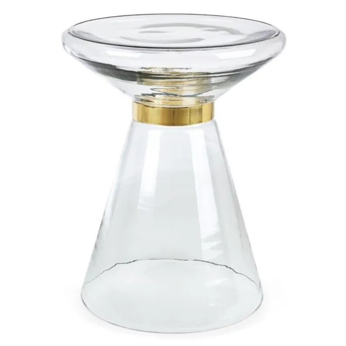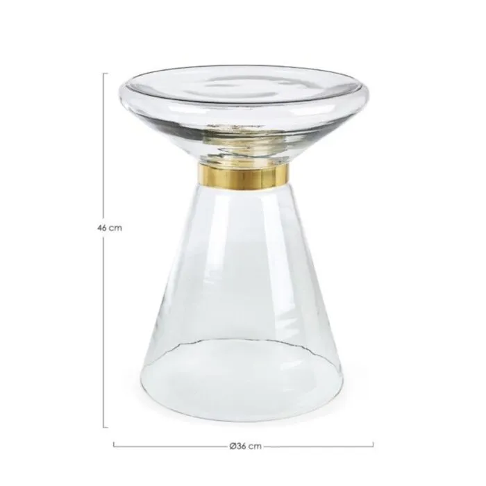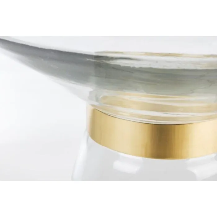 Klubska mizica MERIEL D36 ima stekleni okvir z krasnim obročkom in prrekritim vrhom iz jekla, zlate barve.