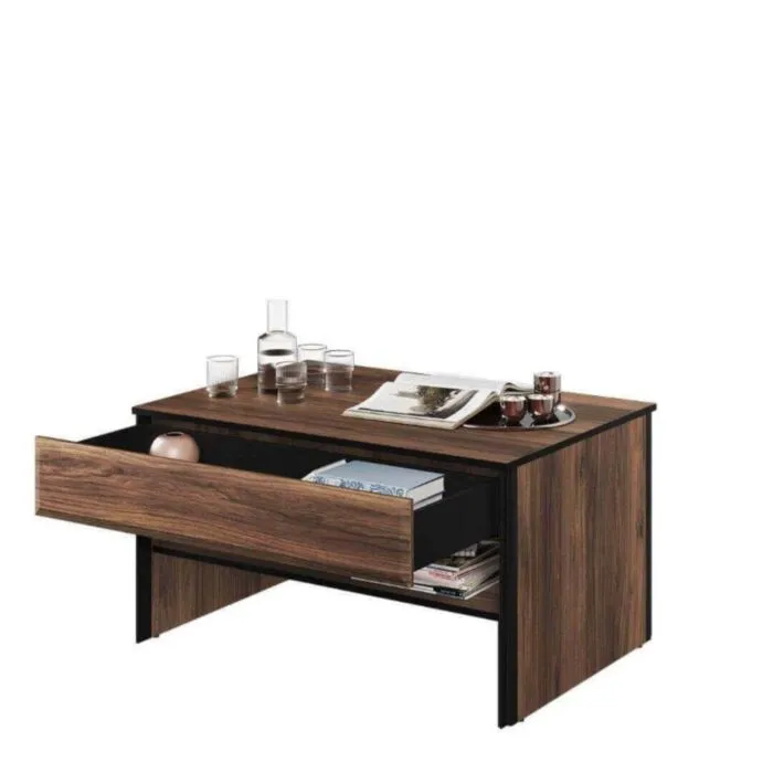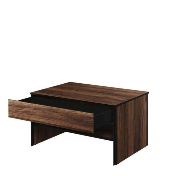 Klubska mizica NAT in predal ter polico. Kombinacija črnega in temnega lesnega dekorja deluje modno in elegantno, hkrati pa v notranjost vnese veliko prijetne topline.