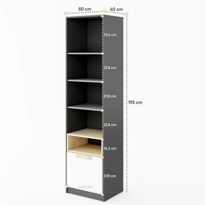 Knjižna omara SIVKO je visoka omara s policami in globokim predalom. Primerna je za vsako otroško sobo, saj je uporabna in hkrati privleče pogled mnogih. Ima kombinacijo treh barv – Svetlo siva / Bela / Grafit.