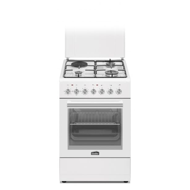 Prostostoječi kombinirani štedilnik Simfer 4312 ZERW, širine 50 cm, se ponaša z 3 plinskimi in 1 električnim kuhališčem ter 48 litrsko pečico s 3 programi peke, dvojno zasteklitvijo vrat, 1 pekačem in mrežno rešetko.