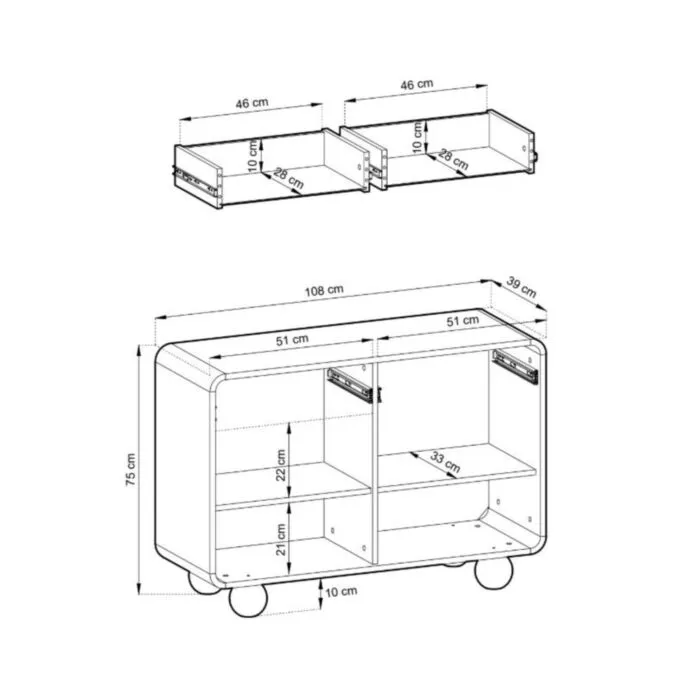 Komoda ALBI mini je elegantna in sodobna. Narejena je iz visokokakovostnih materialov. Zaradi svoje oblike in trpežnih nogic zagotavlja dodatno stabilnost. Okrogle nogice dajajo poseben čar. Narejena je iz laminirane plošče debeline 16 mm v kombinaciji MDF-ja debeline 18 mm. Zaradi svoje oblike in visokokakovostnih materialov je trpežna in vzdržljiva. Odporna je na praske, udarce in obrabo. Je enostavna za vzdrževanje, saj je površina preprosta za čiščenje in negovanje. Estetsko se poda v vsak prostor ter ima dobro odpornost na madeže in vlago.