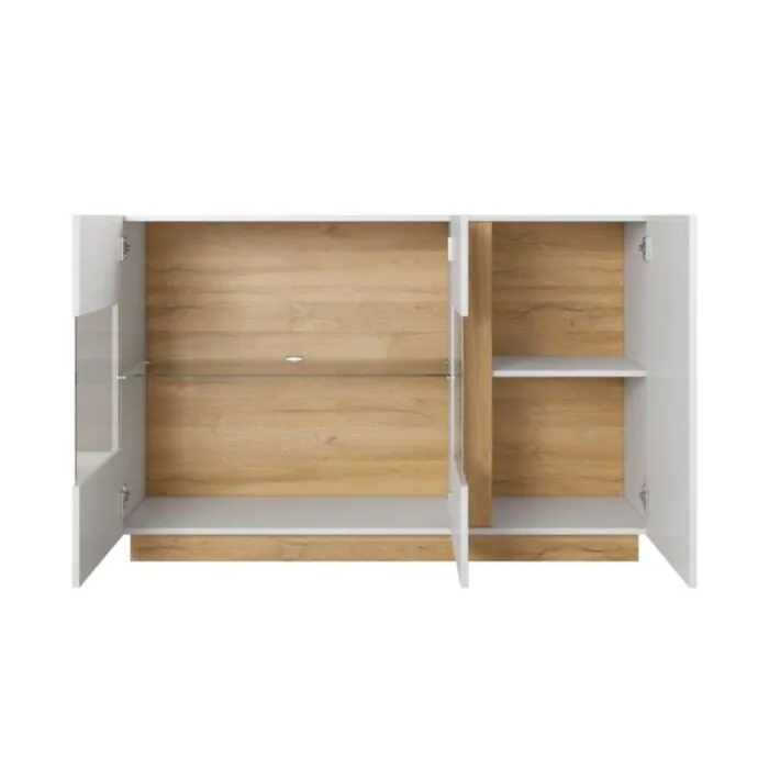 Uporabna in praktična komoda AREK 2. Primerna je za dnevne sobe in jedilnice. Narejena je iz vrhunskih materialov v EU. Komoda ima mehanizem “PUSH TO OPEN” za odpiranje. Komoda je na voljo v beli visoki sijaj barvi, v kombinaciji s hrastom.